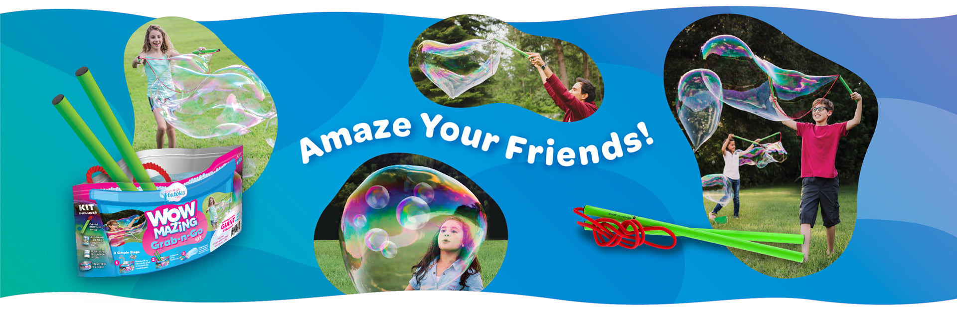 Make one gigantic bubble using the WOWmazing® wands, then slowly blow air towards the larger bubble to create smaller bubbles.