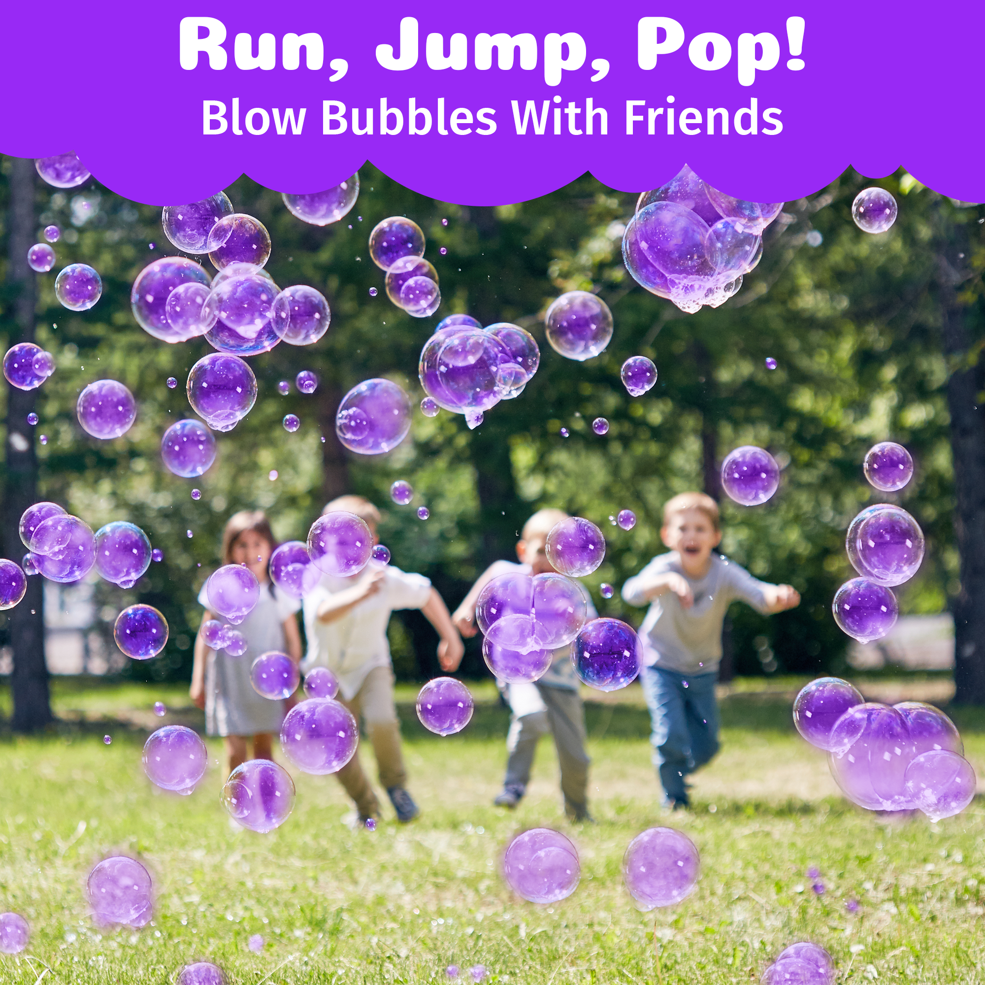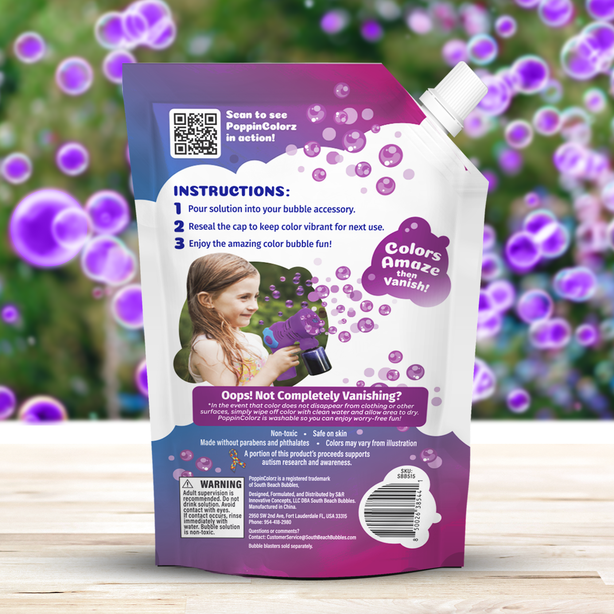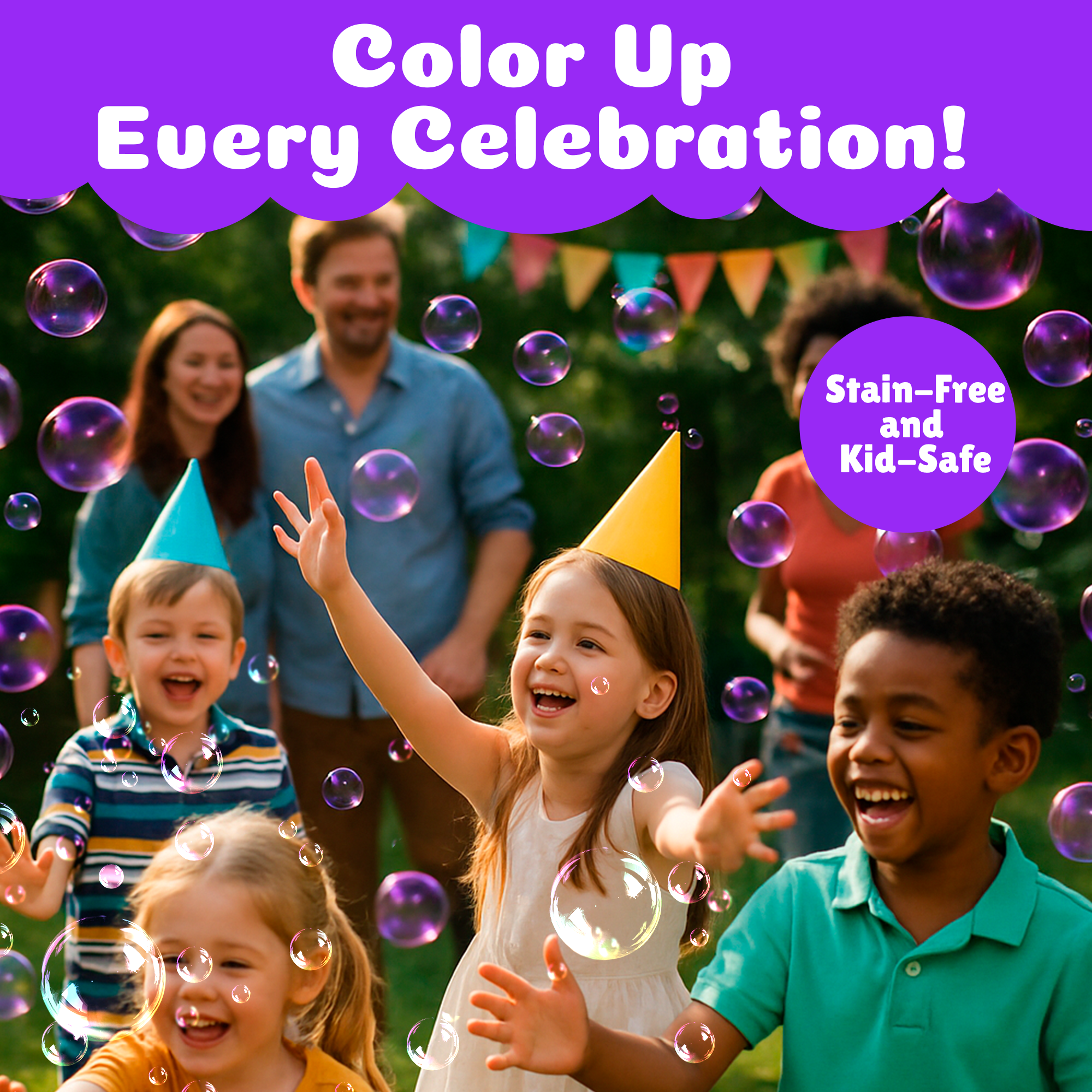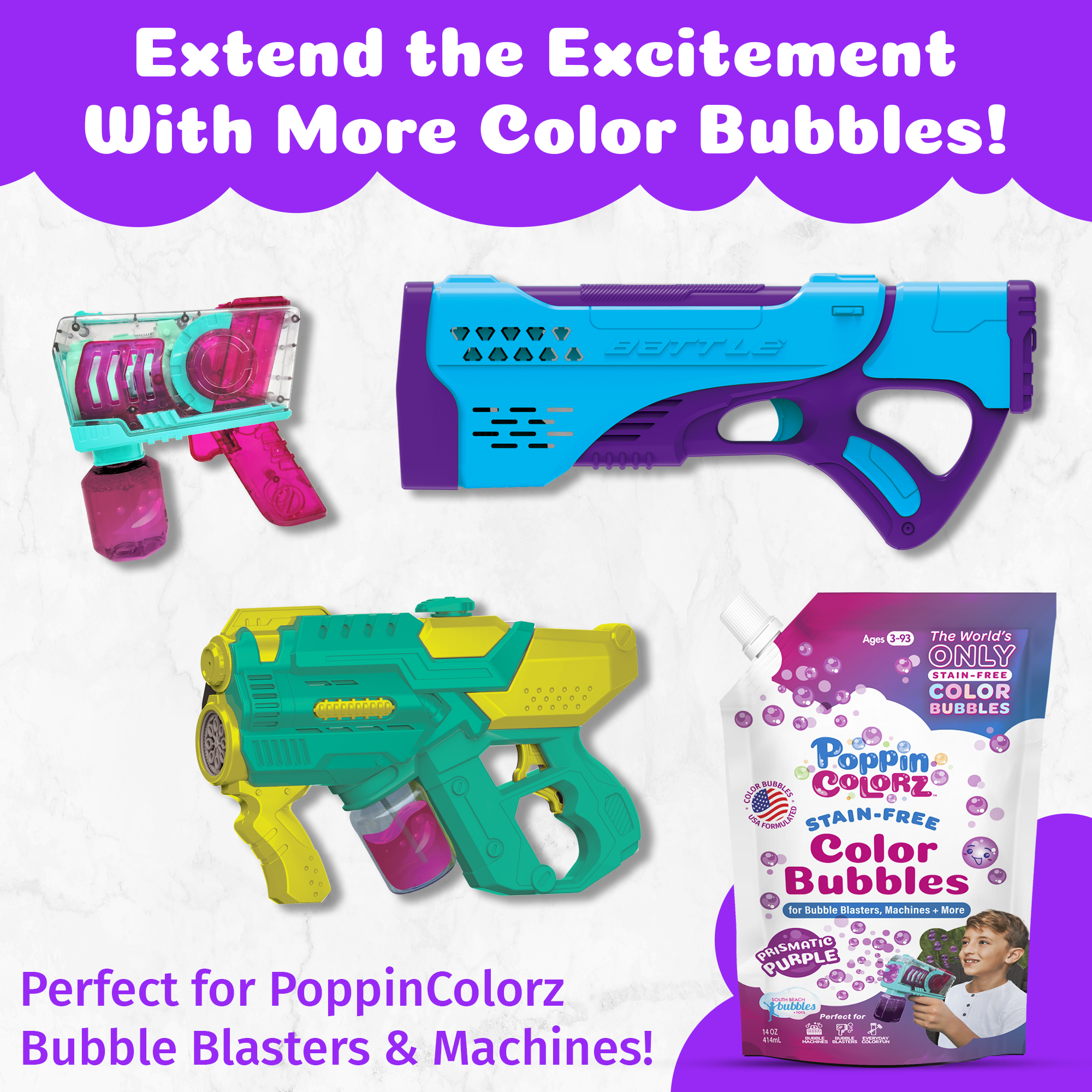 Refill your favorite bubble blasters, bubble machines, mowers, and bubble wands with the World’s Only Stain-Free Color Bubbles in bold Prismatic Purple.